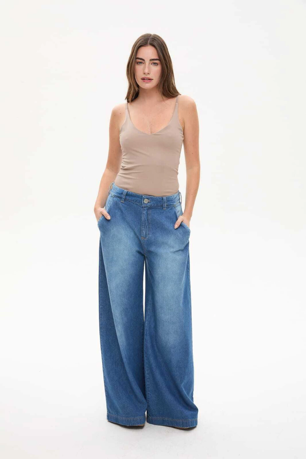 Jean wide leg tiro medio/alto, confeccionado en denim de excelente caída. Presenta pinzas en la cintura, que aportan estructura y un calce más favorecedor, además de un toque sastrero. Sin bolsillos en la parte de atrás, logrando una terminación limpia y estilizada. Su silueta amplia y relajada moderniza cualquier look con un aire fresco y versátil.